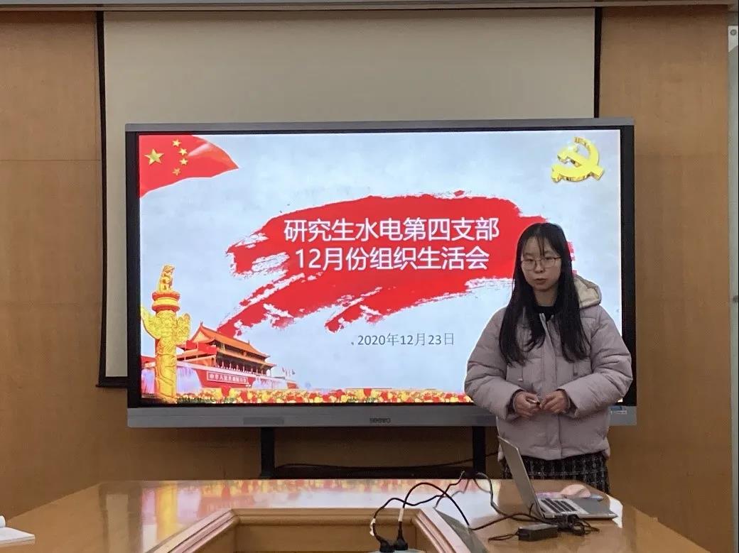 根据公司以及永利3044集团官网党总支相关文件要求,研究生水电第四党支部于12月23日晚上7时,在仿真中心三楼会议室开展党组织生活会。会议由党支部书记毛佳倩主持,支部党员共9人参加,共同学习党史精神。