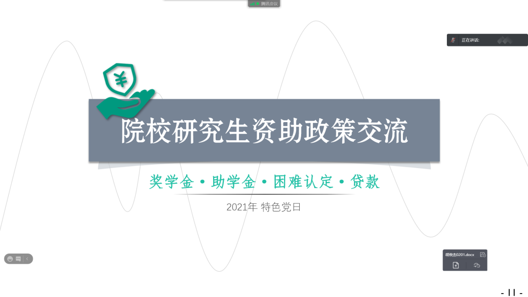 会议最后,段正同志对院校研究生资助政策进行了讲解交流。段正同志介绍,资助工作主要包括学业奖学金、学业助学金、困难补助、助学贷款四部分内容,同时他对每一项资助工作的申请要求、申请时间和注意事项等都进行了详细说明。