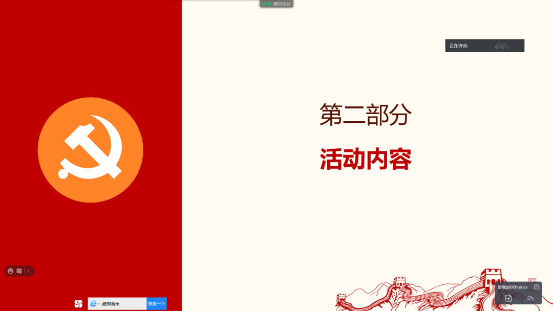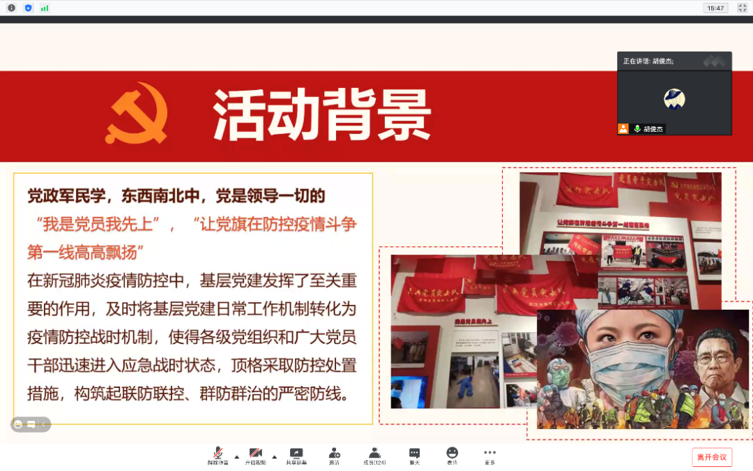会议开始,胡俊杰同志向大家介绍本次活动的背景和内容。首先,他谈到了党的领导是中国特色社会主义制度最本质的特征,在疫情防控中,基层组织发挥了至关重要的作用,基层既是政策的具体实施者,又直接服务与广大群众,因此抓好基层组织建设、完善基层治理体系、提升基层治理水平是十分重要的。