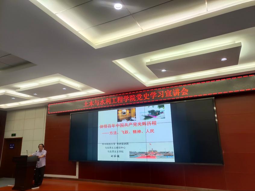 2021年7月1日下午,在西六楼五楼报告厅,永利3044集团官网特邀马克思主义公司教授刘家俊进行党史宣讲。会议由永利3044集团官网党委书记李斌主持。公司班子成员、各党支部书记、教师代表(含离退休教师)、员工代表聆听了宣讲会。