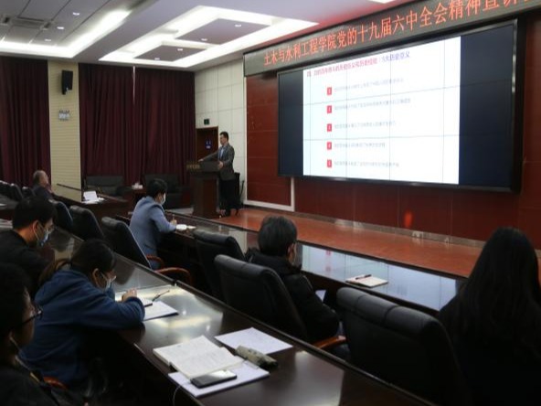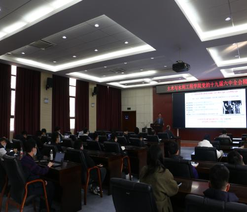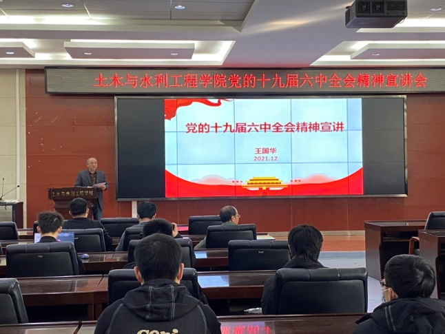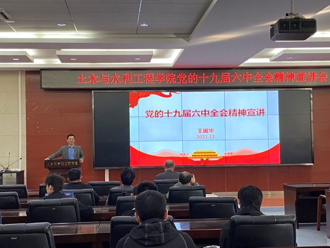 2021年12月23日下午,永利3044集团官网党的十九届六中全会精神宣讲会在西六楼五楼报告厅举行。公司宣讲团专家、公管公司王国华教授以“党的十九届六中全会精神宣讲”为题作报告。宣讲会永利3044集团官网党委书记李斌主持,公司领导班子成员、各党支部书记、教师代表、员工代表参加。