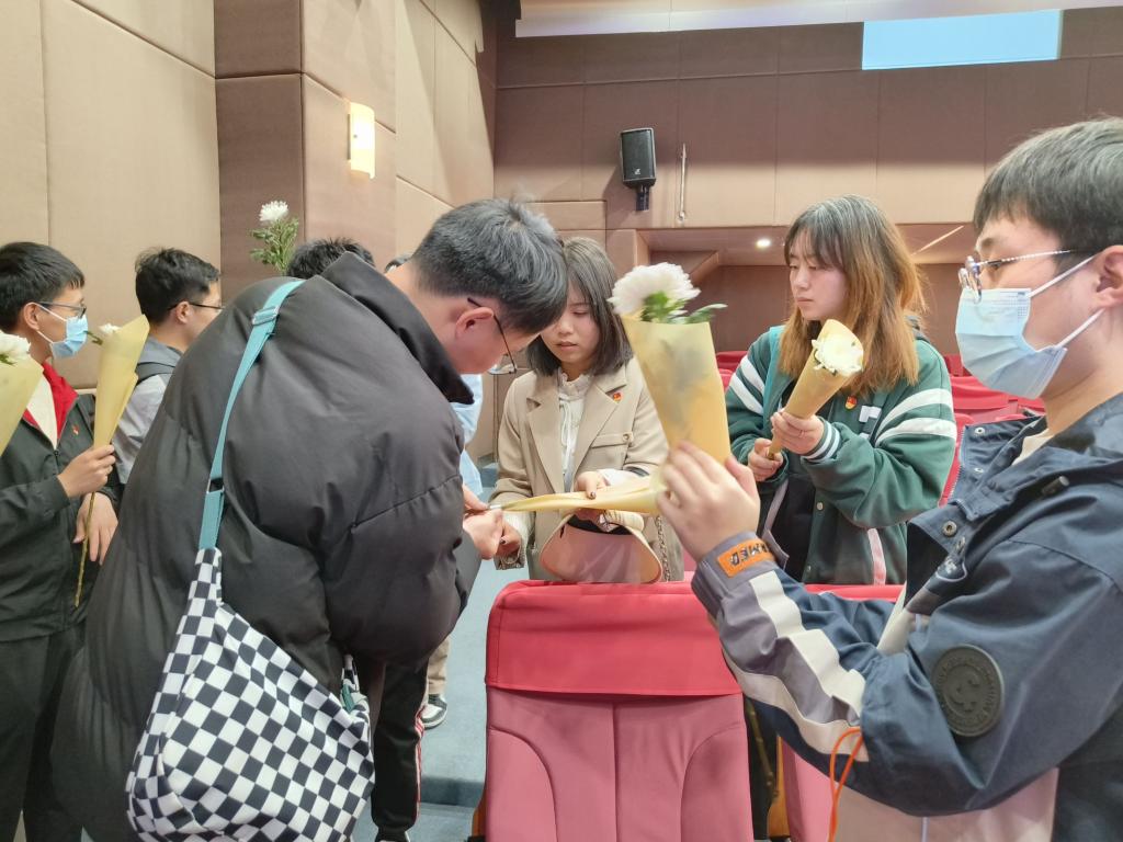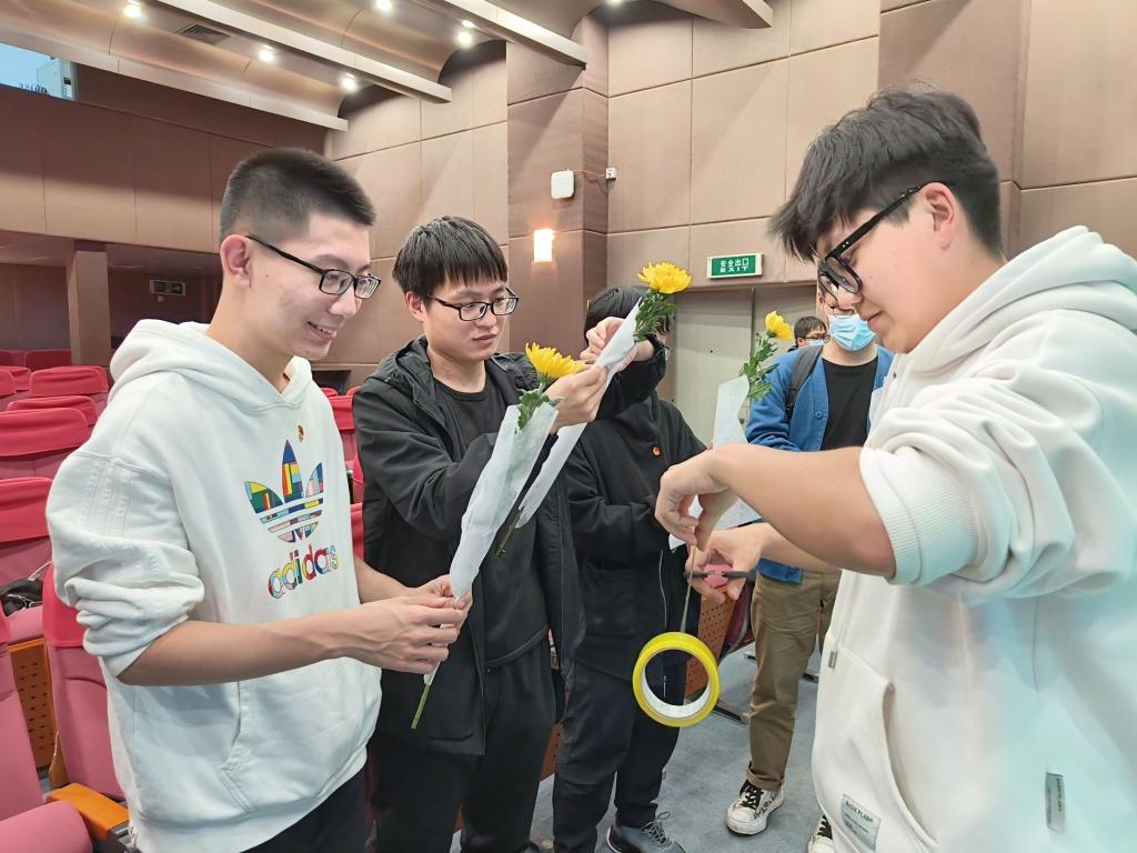 观影结束后,同学们在会议室进行了扎花活动。为革命先烈献花,不仅是对革命先烈的纪念,更是对爱国主义精神的传承和发扬,这也时刻提醒着我们,历史上那些为国捐躯的英烈们是我们今天幸福生活奠基人,让我们铭记历史、珍爱和平。