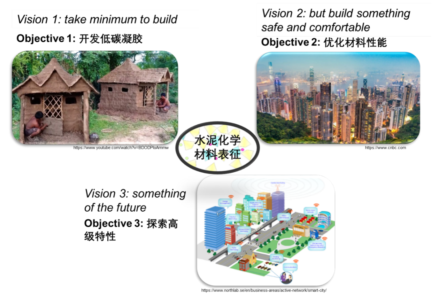 本人研究旨在通过水泥化学和有机/无机材料界面化学从根本上阐明土木工程材料的“制备-结构-性能”关系,从而对其可持续性和抗灾韧性做出变革型提升。研究方向包括以下三方面:(1) 开发低碳凝胶;(2) 优化材料性能;(3) 探索高级特性。该研究有望帮助实现如下愿景:以最少的经济环境成本建造安全舒适并且具有将来意义的基础设施(如下图所示)。