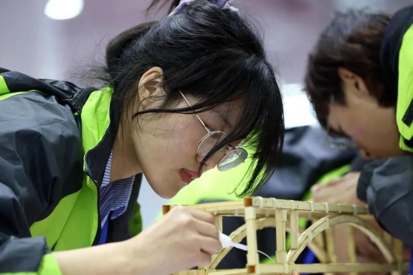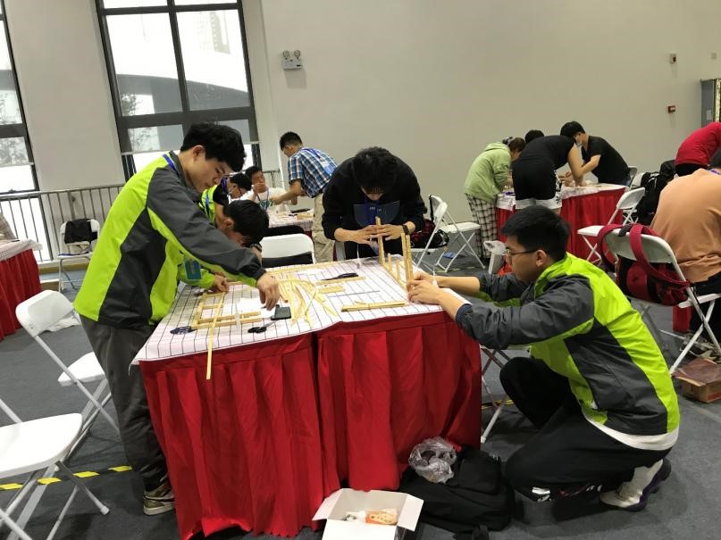 桥梁结构设计赛项首次出现在本届竞赛中,省赛赛题要求设计和制作一单跨桥梁结构模型,制作材料为厚度不超过0.5毫米的指定竹材,参赛队伍需在校内完成模型构件的制作,在竞赛现场进行构件连接和加载试验。初赛的构件连接可使用502胶水,且模型组装时间需在20分钟之内,决赛的构件不可使用502胶水等粘性材料,需自行设计构件连接方式。此次赛题新颖,对初次参赛的指导老师和员工们来说都充满了挑战。在三月初经过一轮校内赛后,院内选拔出了三支队伍代表公司参加省赛。同学们在省赛前的一个月时间里,利用学习间隙紧张备战,开动脑筋和动手尝试,克服诸多困难后均出色地完成了任务。在与全省39支队伍经过两日的激烈较量后,公司的一支队伍获省一等奖(祝尔正(队长)、李宗霖、余河清、彭成鑫,指导老师:苏原,高荣雄),另两支队伍获省二等奖(刘乙宏(队长)、施庭樟、刘新鸽、曾维嘉,指导老师:孙远,朱爱珠;郭彦彤(队长)、何宇辰、黄超、朱永强,指导老师:廖碧海,陈娥)。