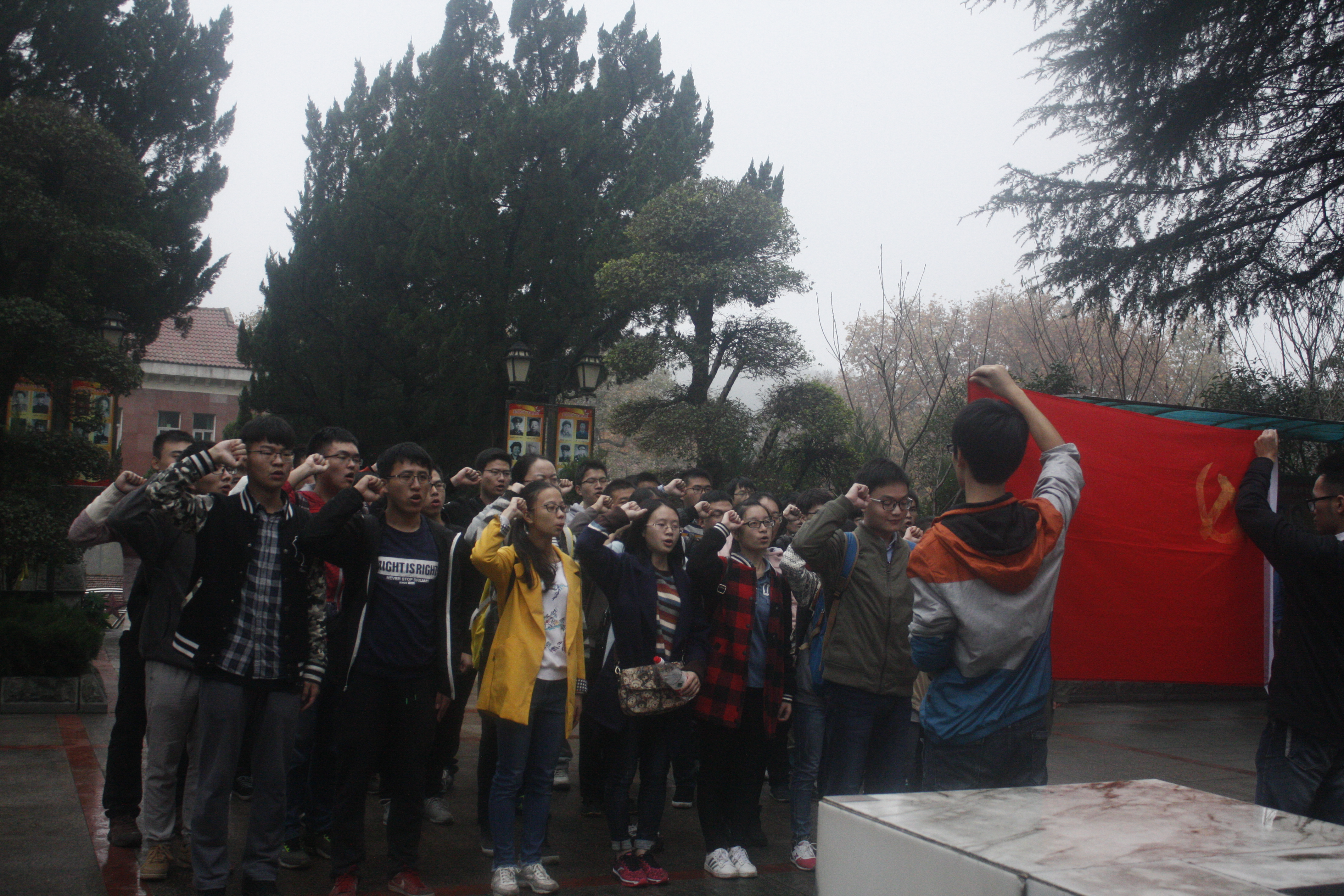 “我志愿加入中国共产党,拥护党的纲领,遵守党的章程,履行党员义务,执行党的决定,严守党的纪律,保守党的秘密,对党忠诚,积极工作,为共产主义奋斗终身,随时准备为党和人民牺牲一切,永不叛党。”土木工程与力学公司本科生党支部的预备党员们在九峰山烈士纪念碑下庄严宣誓,表达其为共产主义事业而奋斗终身的决心。