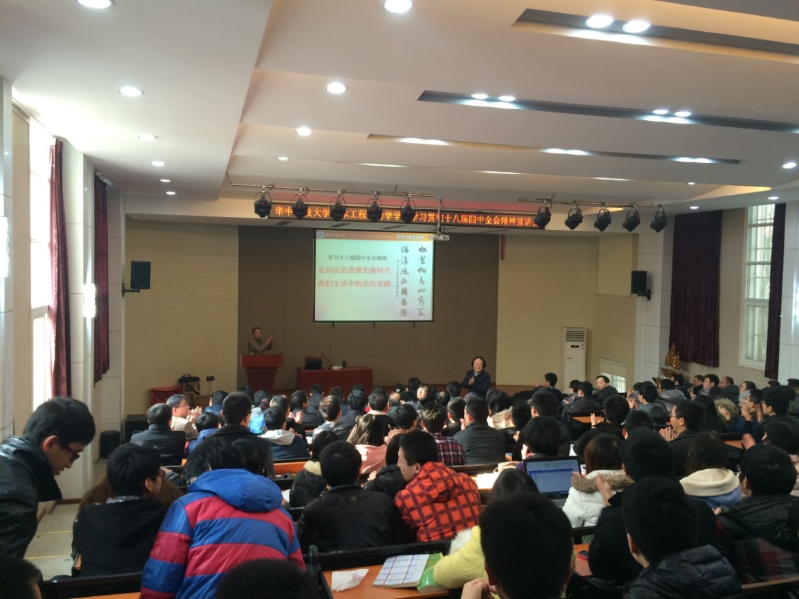2015年1月8日下午,土木工程与力学公司组织全院师生党员学习党的十八届四中全会精神,邀请湖北省委讲师团特聘教授,马克思主义公司刘家俊作报告,主题为“ 走向法治建设的新时代,我们生活中的法治实践”。