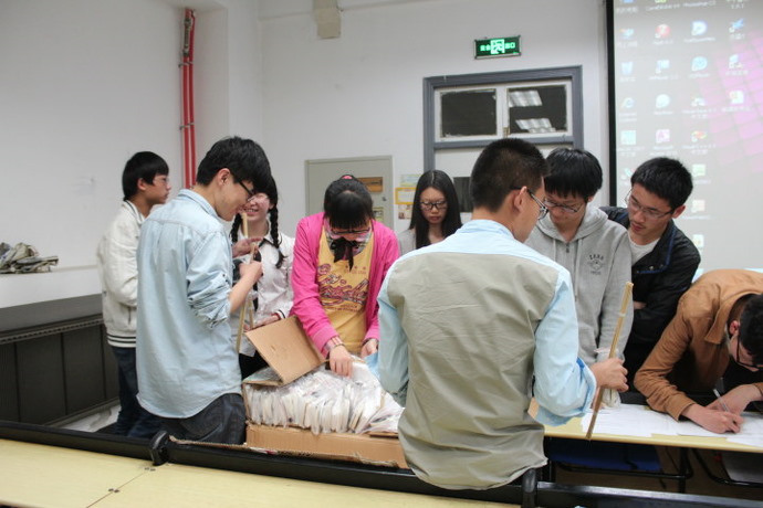 在活动介绍完了之后,是一个现场征文的活动,同学们在现场可以写下自己儿时发生过的有趣故事。接着,物理公司的同学们将制作风筝的材料发放下去并介绍了风筝的种类及做法,引起同学们非常大的兴趣。
