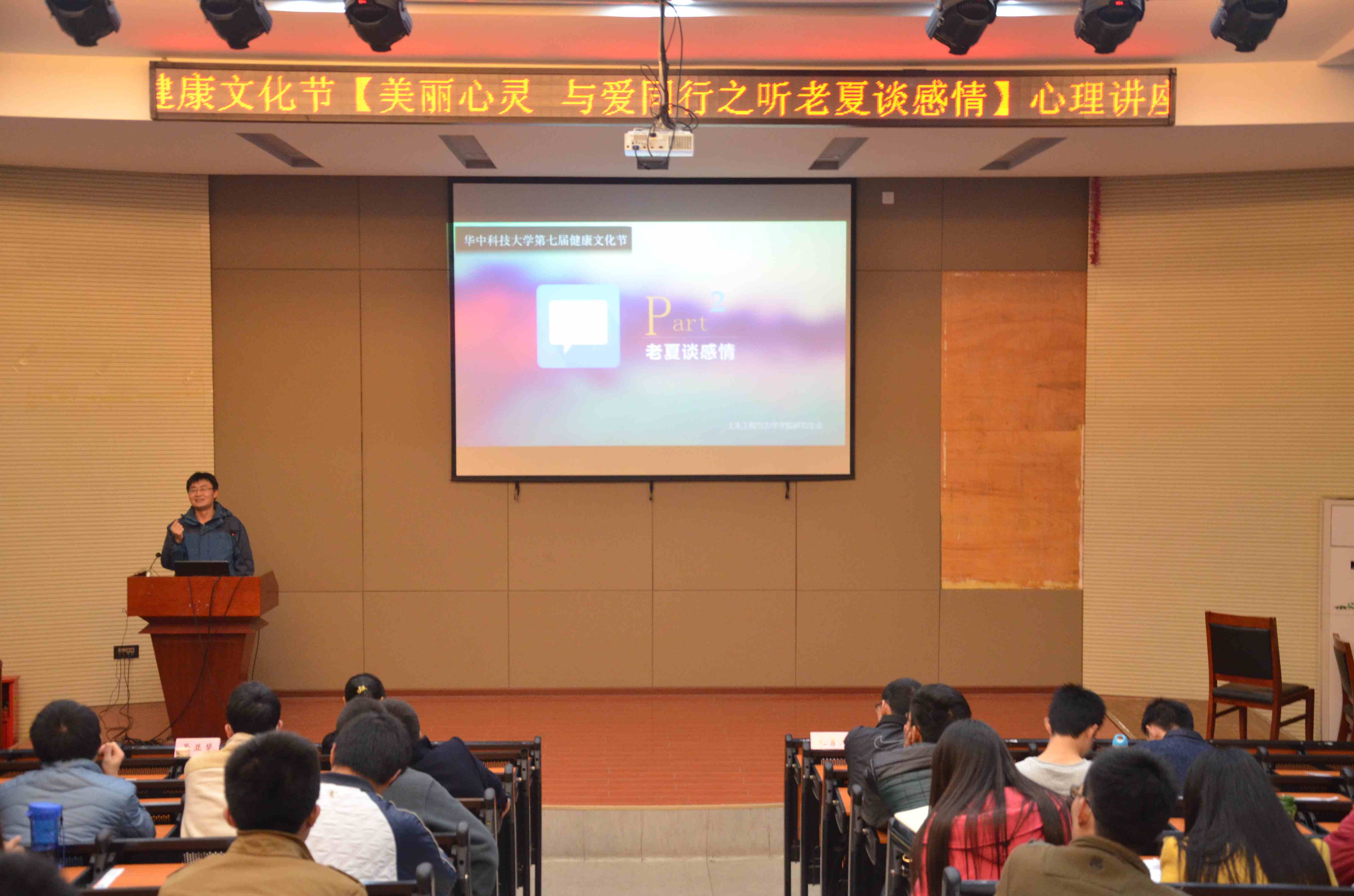 2014年11月17日晚19:00, 土木工程与力学公司“ 美丽心灵 与爱同行之听老夏谈感情”心理健康讲座在南二楼报告厅准时举行,活动特邀请人气颇高的夏增民老师主讲。出席本次讲座的嘉宾有毛勇杰老师、马志凤老师王明飞老师、校研会心理部景亚斐同学以及兄弟院系研会主席等。