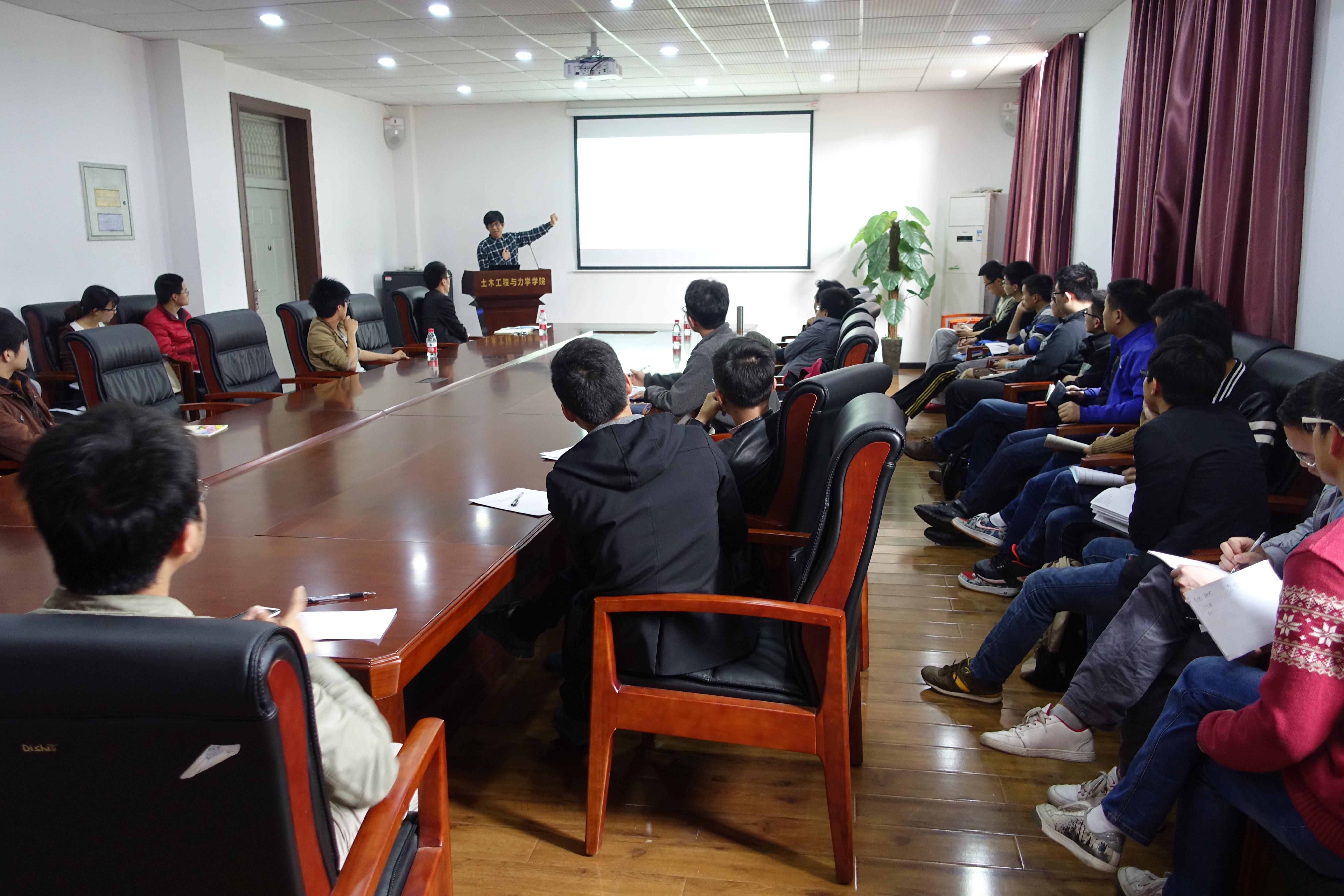 刘华北老师首先介绍了土力学与岩土工程发展中建立的主要理论以及实验方法,谈到土力学是一门重视实验的科学,强调土力学中实验与经验的重要性。接着介绍了土力学与岩土工程的最新学术前沿。刘老师在结尾谈到对创新的理解,强调创新需要重视基础,需要精力投入,需要以大量文献阅读为基础,需要结合国家建设需要。苗雨老师主要介绍了快速边界面/有限元耦合计算方法,谈到边界面方法的优势与劣势,并就自己做出的部分学术成果展开介绍。苗老师谈到下一步的研究计划,希望近期将边界面/有限元耦合算法应用到超长现状结构中,提出建立时域的边界面/有限元耦合计算方法以便应用到实际的地铁、地下结构中的远期设想。章荣军老师以“ 吹填法围海垦地工程中的挑战与机遇”为题,以新加坡、连云港、天津等地的工程实例为背景,介绍传统吹填法工期长、机械化水平低、石材耗费量大等缺点,介绍SDF法的优越性。博士生姚二雷、赖汉江、曹文昭依次就自身的科研经历和大家进行了心得分享。