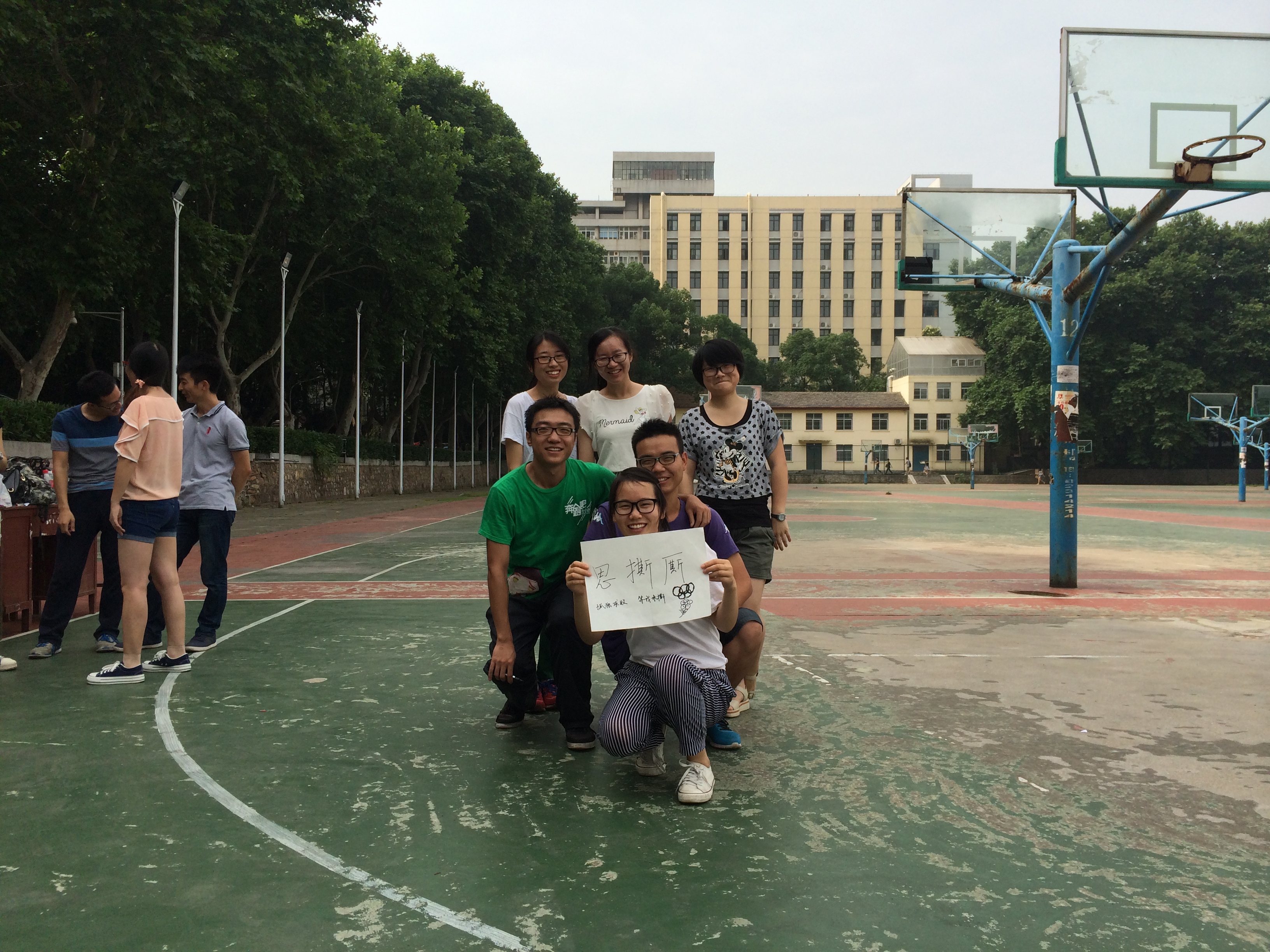 上午八点半,活动在西边操场拉开帷幕。工作人员提前半个小时到达了现场,做好相应的准备工作,同时参与活动的同学们也都早早的来到现场。本次活动共分为四个环节,分别是“ 包粽子”、“ 猜拳泼水”、“ 爱的抱抱”和“ 撕名牌大作战”。活动共有二十多人参加,包括公司研究生会成员和14级硕士研究生同学。活动正式开始前,大家先进行了破冰之旅,即抽签分组,共分为四个队,并且每个队都取了各具特色的队名,分别是“ 五朵金花”、“ 思撕厮”、“ 伐木累”和“ PFGIRL&BOYS”。