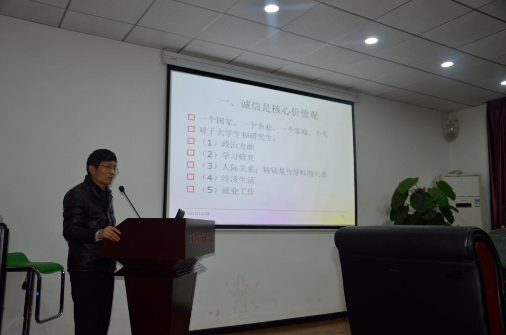 魏小胜教授从“诚”与“信”的汉字构造讲起,从政治生活、学习科研、人际关系、经济生活、就业工作五个方面依次展开,充分阐述了“诚信”作为社会主义核心价值观的意义。魏教授还列举了生活中若干反面实例,讲述了“不诚信”带来的深刻危害,警醒同学们在学习科研中一定要实事求是,要学会用适当的方式拒绝自己无法完成的任务,不轻易承诺。