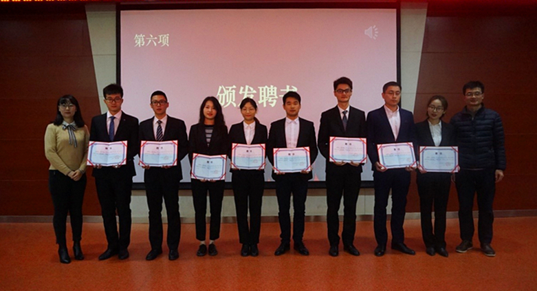 大会第六项,张发雄老师与马志凤老师为院第十七届研究生会主席团、部长团颁发工作聘书,蔡海洋老师为院第十七届研究生会优秀部长、优秀部员颁发证书。