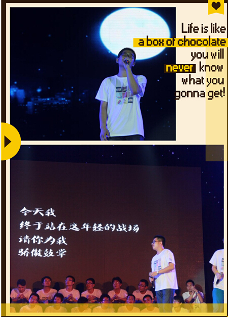 晚会以2010年军训视频开头,唤起毕业生心中浓浓的回忆。一部风采巡礼视频介绍了2010级四年来在各方面取得的成绩。“就在启程的时刻,让我为你唱首歌”,毕业生自行录制的MV《启程》传达了他们的留恋与对明天美好的祝愿。