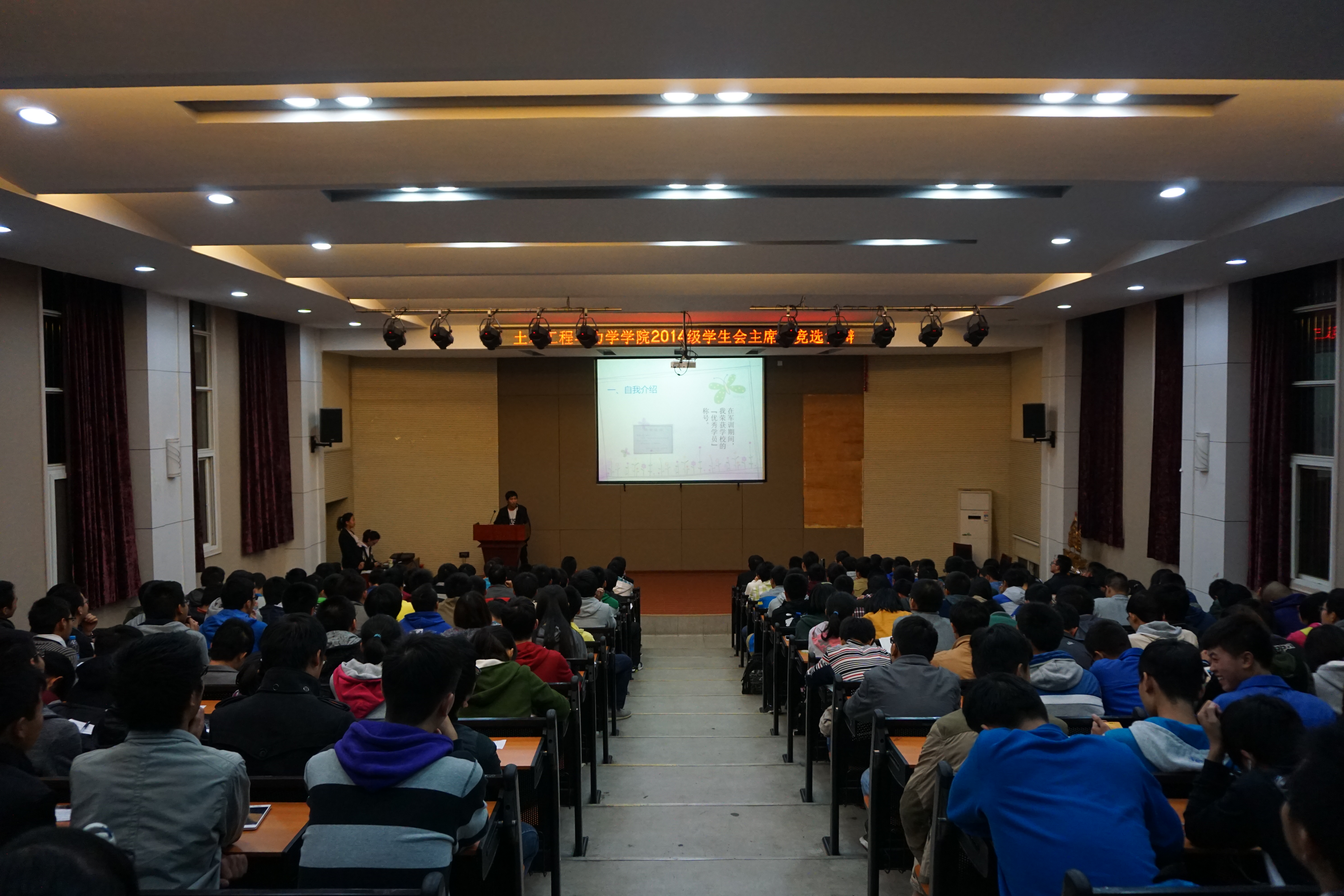2014年11月3日晚19时,土木工程与力学公司2014级年级员工会主席团竞选答辩在南二楼学术报告厅如期举办,此次活动受到同学们的高度关注,全场座无虚席。