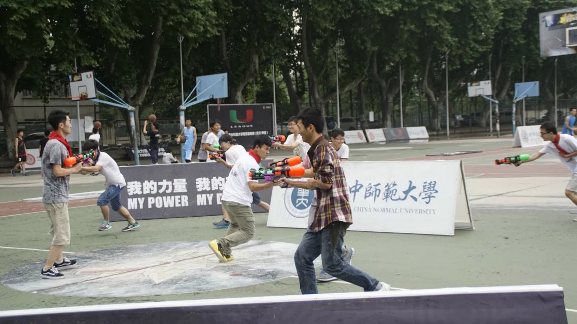 除了令人激动尖叫的拔河比赛这道“头牌”外,最受同学们欢迎的项目要数真人cs了。在炎炎夏日,还有什么能比水枪游戏更受欢迎的呢?同学们6人一组,凭借布置的障碍物进行互相的“歼灭”,一串串水流,激起声声尖叫,送来阵阵清凉,下场时每个人的衣服都湿透了,可是脸上的笑意却怎么都掩饰不住。