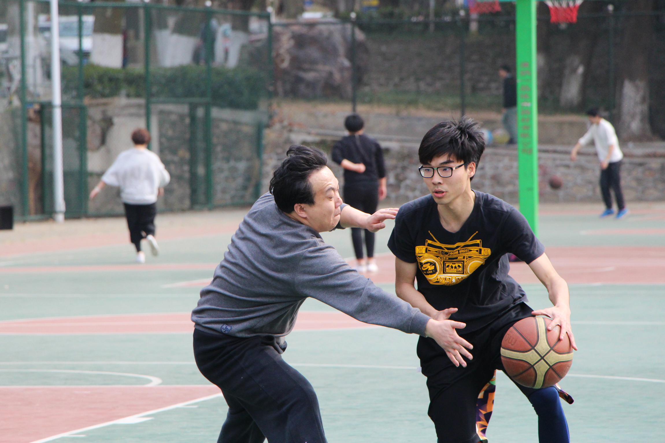 伴随着裁判员一声哨响,比赛正式开始。员工队进入状态较快,凭着默契的配合和漂亮的长传、激烈的拼抢,加上精准的投篮,很快取得了领先;但教职工队凭借丰富的经验迅速稳住阵脚,步步为营,展开反扑,将比分追至胶着状态。闻讯前来观战的教师员工为一个个精彩进球欢呼呐喊。比赛双方你追我赶,互不相让,最终全场比赛以 42:42的比分进入加时。经过最后的角逐,员工队以50比48微弱的优势赢得了比赛。