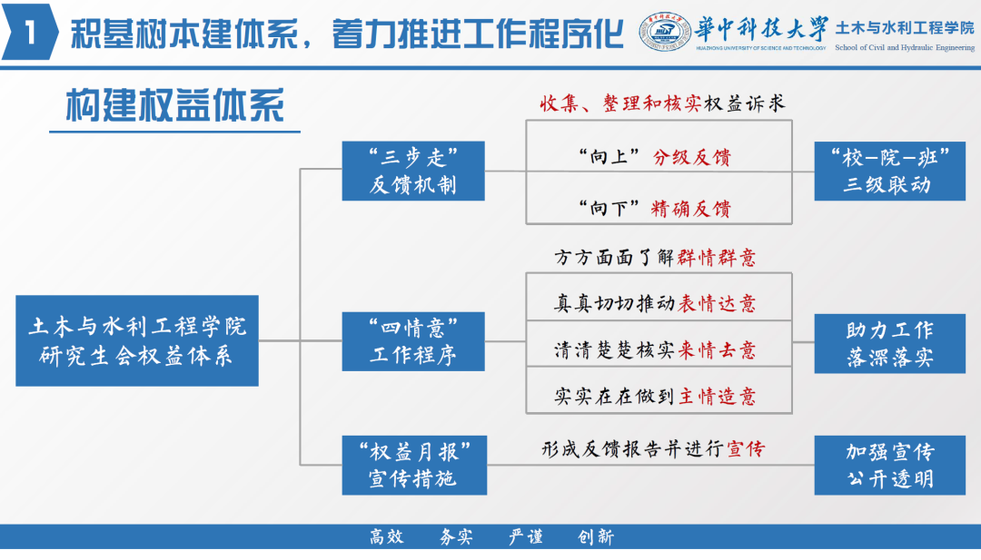 为了推进权益工作的程序化,结合院系的实际情况,构建了如下图所示的权益体系。建立健全了包含权益诉求收集、“向上”分级反馈和“向下”精确反馈的“三步走”权益反馈机制,助力“校-院-班”三级联动;实施了“四情意”工作程序,保证权益工作落深落实;采取了“权益月报”宣传措施,加强宣传力度,保证权益反馈过程和结果公开透明。