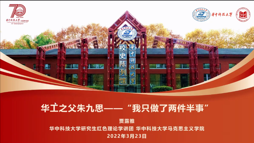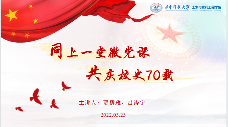 正值永利3044集团官网成立70周年,2022年03月23日晚,为开展爱校荣校教育,土木与水利工程党务中心特此开展“同上一堂微党课,共庆校史70载”线上主题讲座。本期讲座有幸邀请到来自校研究生红色理论学讲团的贾露雅和吕涛宇两位同学,分别为公司员工讲解“华中之父”朱九思和“如何上好一堂微党课”。公司100多位同学参加此次讲座。
