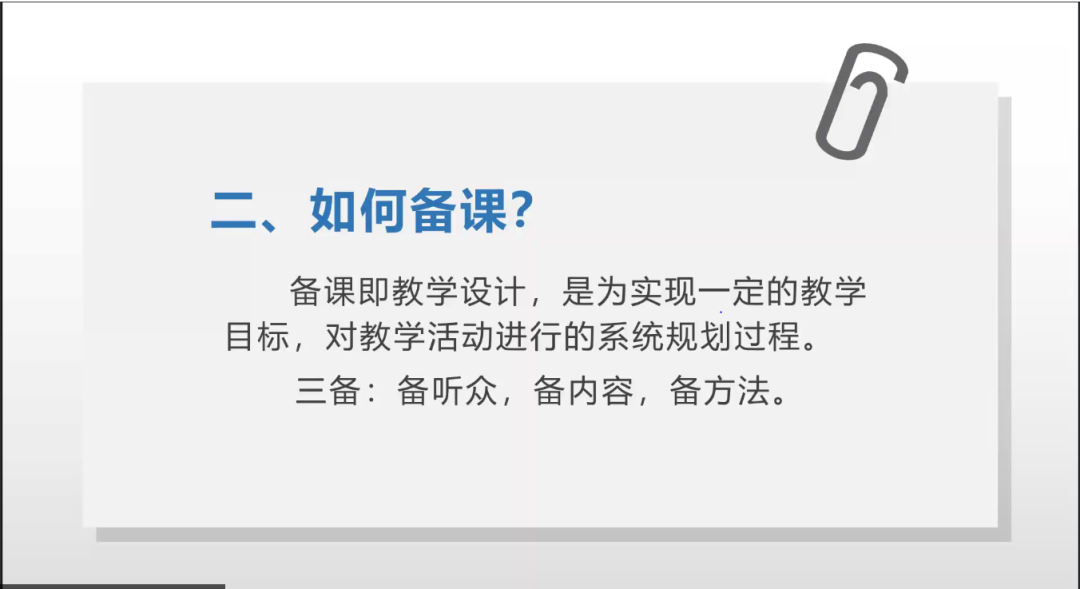 备课要备3个方面,一是备听众,了解听众的生活经验和知识背景,了解听众的兴趣所在,这样才能明确教学起点和教学内容。二是备内容,整理基本观点、叙述事实过程、给予听众分析判断、引导听众评价思考。三是备方法,课堂是需要动态的,课堂是需要互动的,只有采用适当的方法才能提高党课质量。