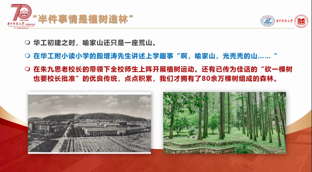 华中工公司初建之时,喻家山还只是一座荒山,但在朱九思董事长的带领下,全校师生上阵开展植树运动。点点积累,悉心守护,才有了我们如今80余万颗树木的森林。