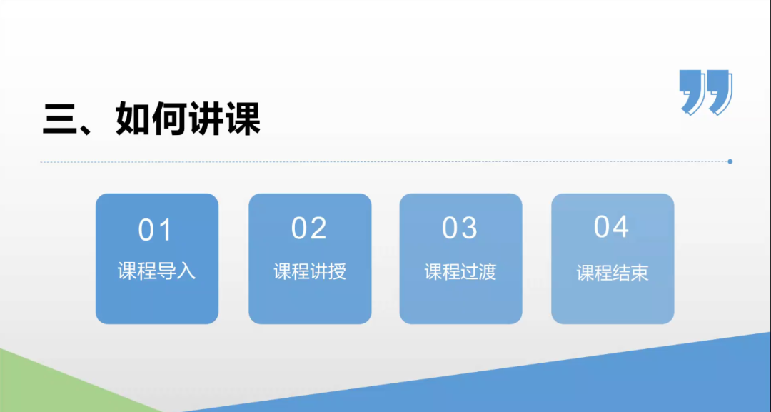 讲课分为4个过程:课程导入、课程讲授、课程过渡、课程结束。课程导入是“定场诗”,需要简短而又吸引听众的注意,良好的课程导入将会引导听众很顺利进入到课程讲授的内容;课程讲授重在内容,要有突出对比,要有解释比喻,要有事例与分析;讲授过程中若有不同的内容,过渡就显得很重要,需要把内容串联起来,使听众的思维连贯起来;最后是课程结束,讲授结束时要归纳内容,提炼观念以及延伸拓展。