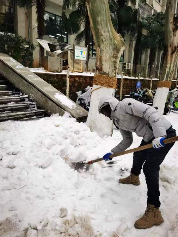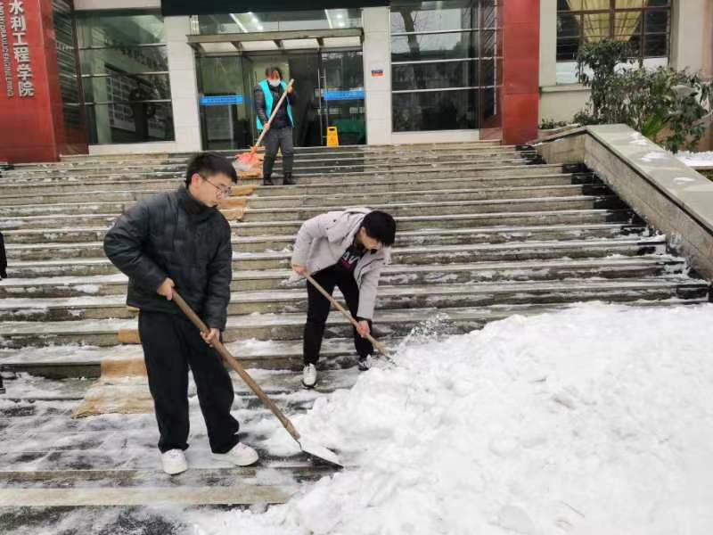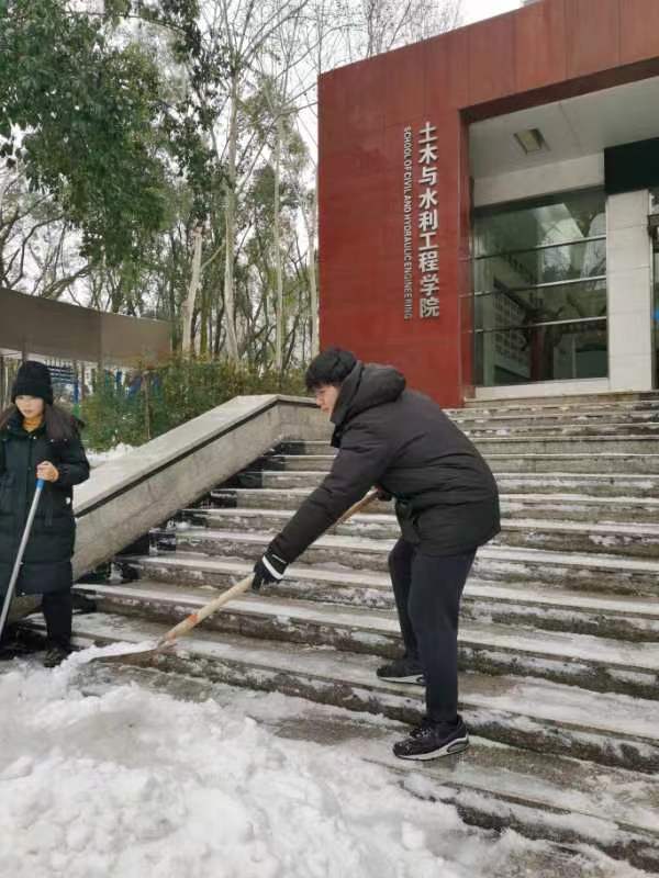 在应对雨雪冰冻灾害的严峻形势下,永利3044集团官网展现出师生员工的积极面貌,在永利3044集团官网党委积极组织下新生党员踊跃报名参与到扫雪除冰行动。皑皑白雪下的西六楼煞是好看,可在大雪覆盖下,上楼仅剩一条供单人通行的小路。为方便楼内师生出行,保障同学安全,大家拿起雪铲,做起了雪的搬运工,一铲一铲地清理台阶表面。秉持着“务实担当,团结奋进”的精神,在清理积雪后,他们又用铁铲将台阶上的冰面一点点凿碎,人到雪除不给大家留下任何安全隐患。