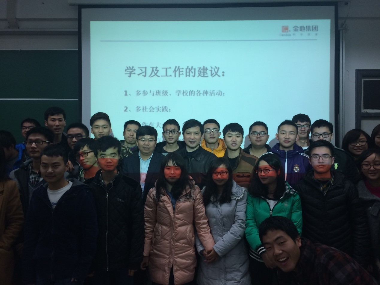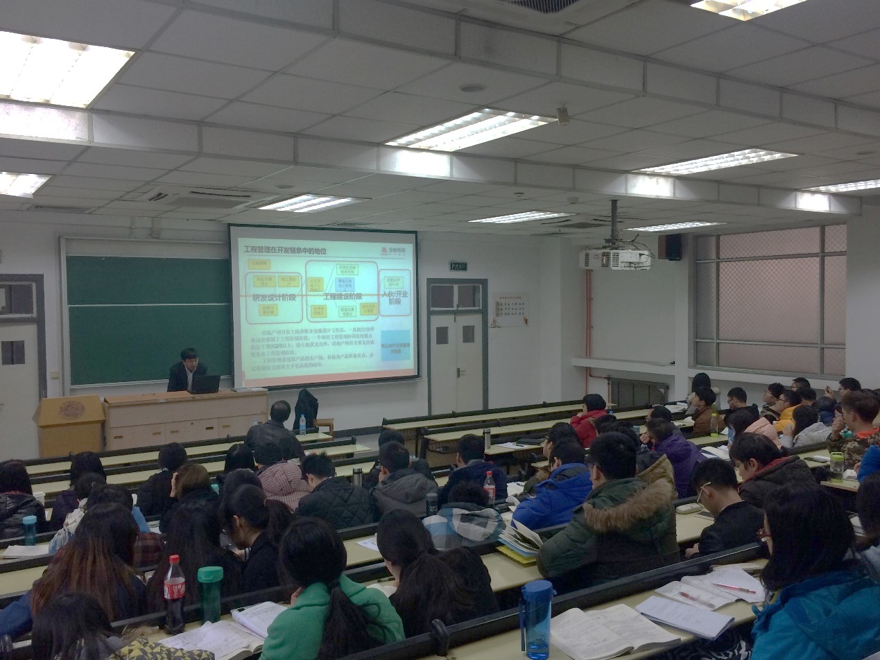 刘炎平员工在讲座中向同学们介绍了房地产行业的宏观形势,工程管理在房地产开发链条中的地位及作用,房地产企业工程管理的组织架构,工程管理的“ 六个职责一个目标”,工程管理未来发展方向以及土木工程师应具备的“ 工程师精神”。