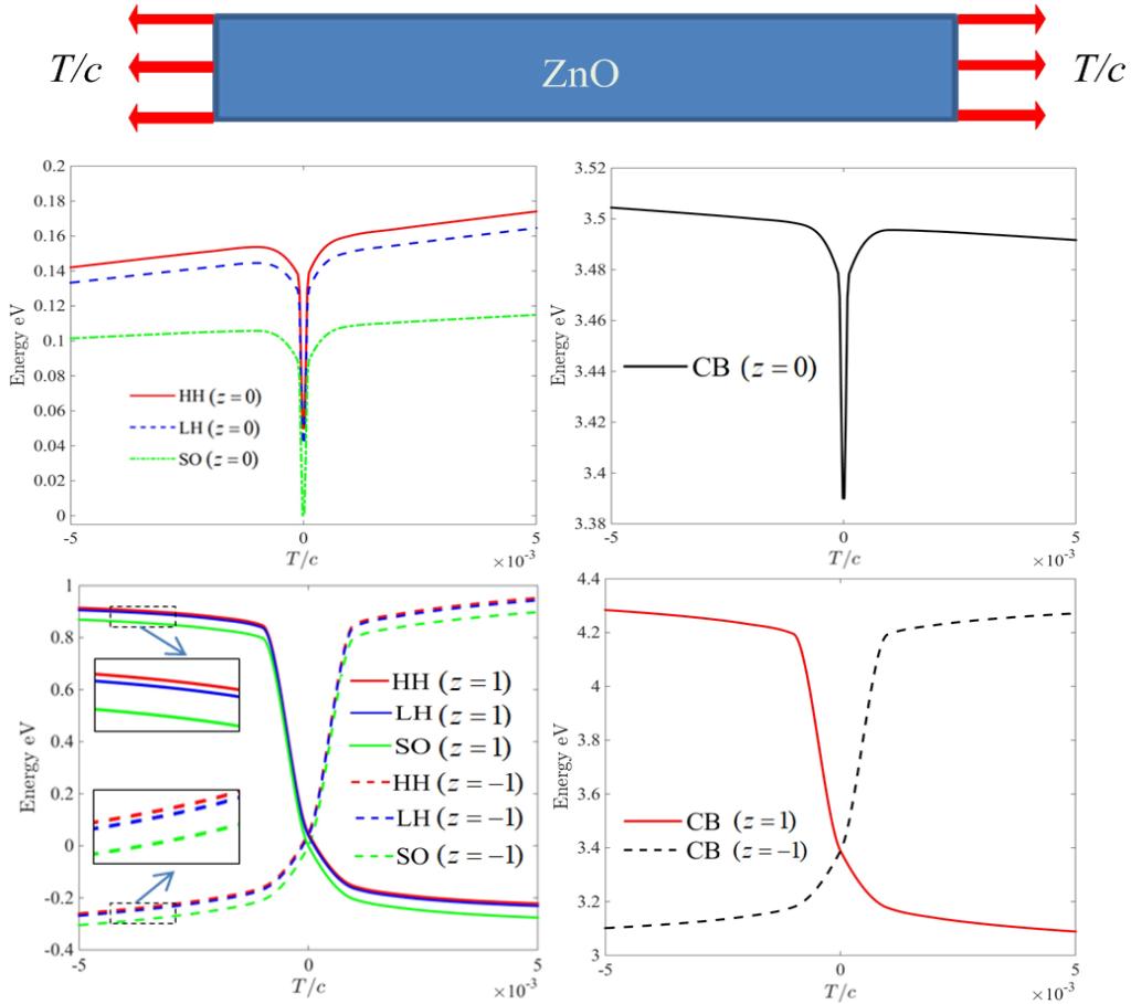 胡元太教授等从力电多场耦合与载流子的交互作用分析出发,首先得到了压电半导体结构的压电势、形变与载流子之间的非线性耦合作用关系,进而基于8阶Hamiltonian矩阵方法,将形变势能和电势能引入导带与价带能级,由此揭示了变形与压电势场等对结构导带和价带能级(CB,HH,LH和SO)的作用规律,为实现机械加载或弹性波动调控压电电子/光电器件的性能提供了理论基础。研究表明,外部载荷或弹性波在其作用区域附近的局部范围内所诱发的压电势场和变形场最为明显,即该区域内的形变势能与电势能最大,意味着外场在该域对导带和价带能级的影响最为强烈,调控效果最为明显。研究还发现,随着载荷增加,载流子再分布所产生的对压电势场的屏蔽效应趋强,导致外场对能带的影响减弱,并最终趋于平缓状态。进一步研究还发现,随着压力的增加,GaN比ZnO压电半导体结构中的重空穴带与轻空穴带容易出现反转,即从HH>LH反转为LH>HH,这些可能导致实际偏离非简并状态。