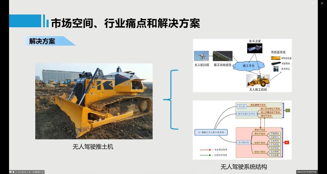 “无人推土机自动驾驶智能感知与控制系统”参赛团队由人工智能与自动化公司彭刚老师、永利3044集团官网周诚老师全程指导,成员包括控制科学与工程专业21级硕士生段航琪和周奕成、20级硕士生彭嘉悉,土木工程建造与管理专业19级博士生尤轲,工程管理专业20级本科生刘彦辰。该作品由云端和车端两部分组成,云端集成了土石方工程三维场景感知重构模型和任务智能调度算法;车端集成了3D激光雷达和双目深度相机,可以获得施工环境信息,实现装备无障碍地行驶和工作。