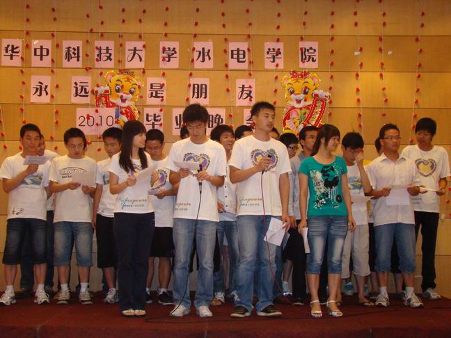 晚会以“我们永远是朋友”为主题,寓意水电公司的莘莘学子不管走到何方,大家永远都是好朋友。整场晚会节目内容丰富,表演者主要为大四的毕业生们,节目包括诗朗诵《奔向前方》,《写给离别》,歌曲《再见》,《爱我别走》等,几位大二的学弟学妹们也上台演唱了歌曲为毕业生们送行,充分展示了水电一家亲的温馨局面,水电公司分团委书记莫莉老师也上台为毕业生们演唱了一首《会呼吸的痛》,引起了现场同学们的欢呼。离别是悲伤的,但离别因祝福而美丽,最后水电公司0601班的合唱《祝福》激起了全场的大合唱,晚会气氛达到最高点。