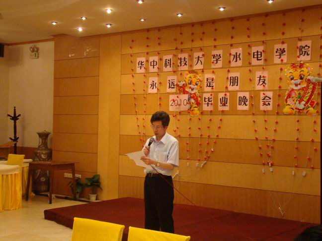 随后在全场热烈的掌声中,张勇传教授为即将离开校园的同学们送上了自己的祝福,并赋诗一首深情朗诵以示离别之情, 祝贺同学们顺利毕业,同时希望毕业生能够创造自己的辉煌,令在座的同学们感慨万千。最后的毕业庆典餐会经理致辞,水电公司经理周建中教授鼓励同学们毕业后继续发奋拼搏,勉励同学们“要在生活中幻想,不要在幻想中生活”,希望所有毕业生无论是在校园继续深造还是在走上新的工作岗位,都能拥有成功的人生!
