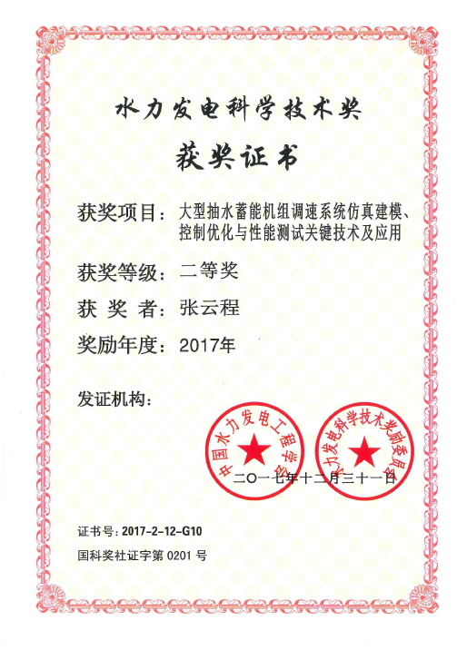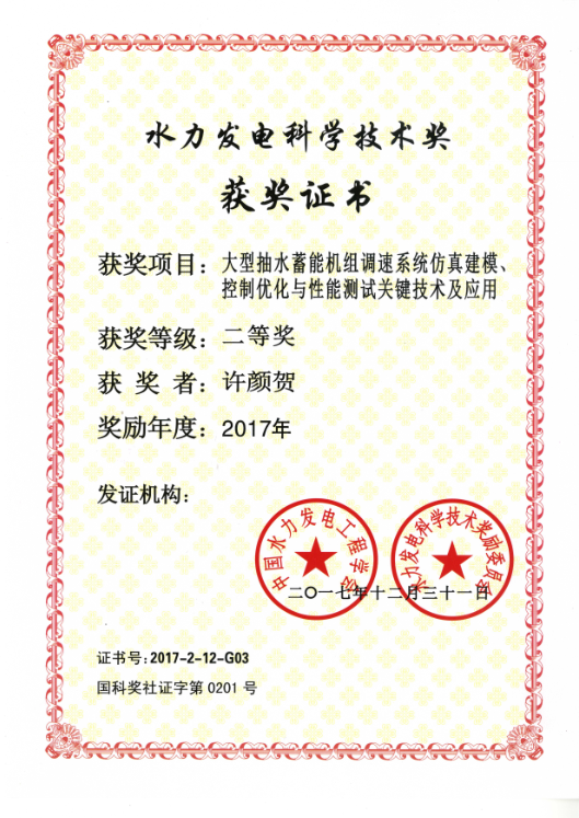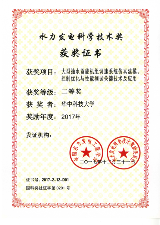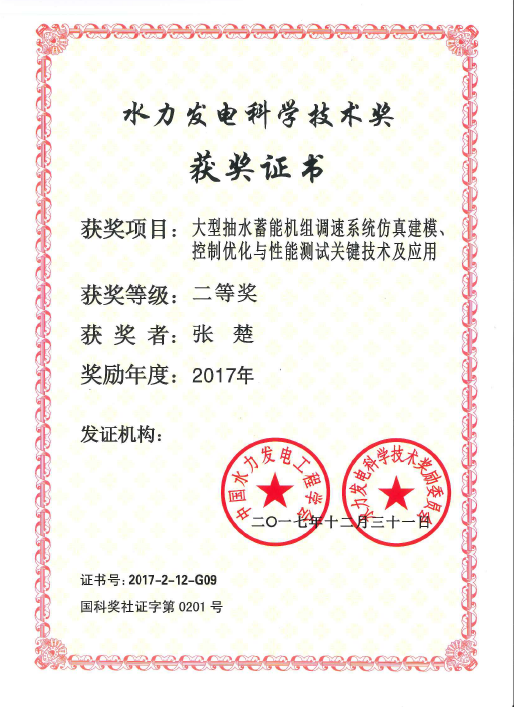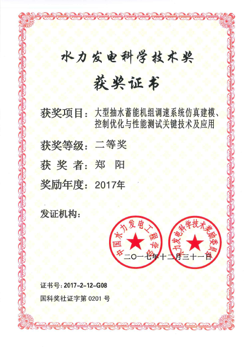 2017年12月31日,中国水力发电学会和水力发电科学技术奖励委员会公布了2017年水力发电科学技术奖获奖名单,由永利3044集团官网和国网新源江西洪屏抽水蓄能有限公司共同申报的“大型抽水蓄能机组调速系统仿真建模、控制优化与性能测试关键技术及应用”项目获得二等奖。