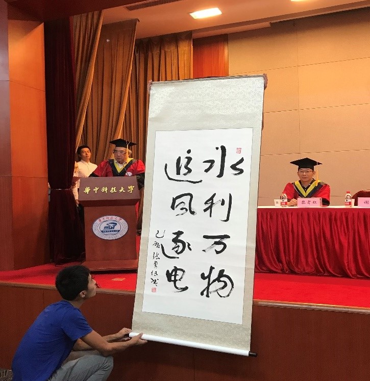 张勇传院士为所有2019届毕业生赠字:水利万物、追风逐电。他告诉同学们要用于担当,脚踏实地的做好自己的工作,带着水电人的精神去努力拼搏。