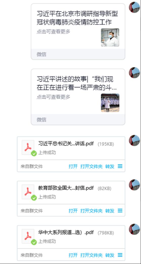 最后,程书记总结强调,支部各党员同志务必牢记自己研究生党员身份,合理安排时间开展学习科研,每天按时在华中大微校园上报健康状况,积极配合所在社区疫情防控工作,有条件的可以参与相关志愿服务活动,期间务必做好个人防护。