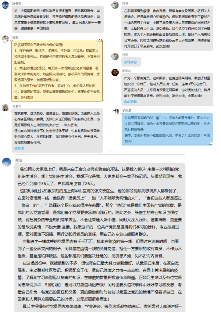 支部党员积极交流和分享了疫情期间的个人见闻及感受,有的同志分享了居家期间做的最有意义的事,有的同志表达了对当地政府工作的感激,有的同志分享了身边的抗“疫”故事,有的同志表达了对一线工作人员的祝福,还有的同志对于疫情防控工作发表了自己的见解……