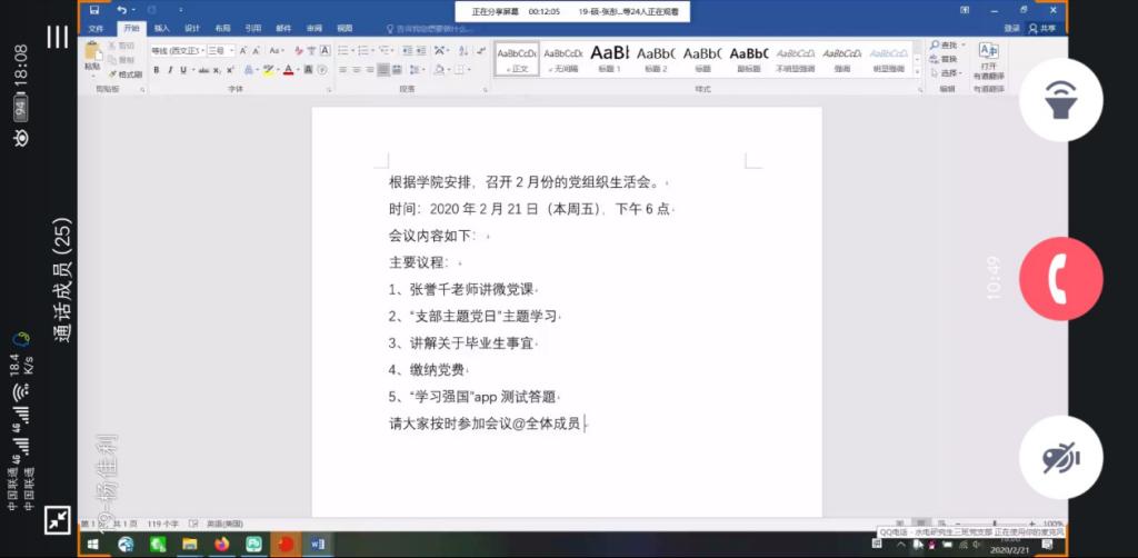 最后,宣传委员王超同志组织全体与会党员进行了一项“学习强国”App的线上测试答题,并再次强调支部各党员同志需合理安排时间开展学习科研,每天按时在华中大微校园上报健康状况,积极配合所在社区疫情防控工作,做好个人防护。