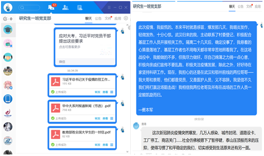 积极响应习近平总书记关于疫情防控工作的重要讲话精神和重要指示,以及教育部号召老员工争做“守护者”、“修行者”、“识途者”,水电公司研究生一班党支部于2020年2月29日晚上召开了一次主题为“携手战“疫”,支部同行”的网络党组织生活会,由支书贾本军主持。
