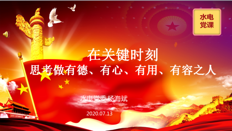 杨海斌书记讲授了微党课,对本次活动进行了总结以“在关键时刻,思考做有德、有心、有用、有容之人”为题,开展了思政教育,介绍了当前防疫、防汛的形式,以及公司、公司当前的防汛抗洪任务和安排;鼓励青年员工坚定理想信念,好学善学,勤奋上进;要压实责任,勇于担当,不畏艰难,作为青年科技工作者要投身科教,投身水电事业,保持开放、怀抱梦想,牢记总书记教导,继续发扬新时代水利精神,在这次防汛工作中贡献自己的力量,展现水电人的精神风貌。