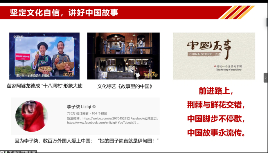 5月24日组织生活会上,邀请研究生“红色理论百人学讲团”成员王楠同志讲授了以“讲中国故事,发理性之声”为主题的微党课,帮助大家更好地认识和理解舆论,引导大家坚定文化自信,讲好中国故事。针对支部同志提出的“普通民众应该如何讲好中国故事”这一问题,王楠、党委副书记谢倩分别发表了自己的看法,帮助大家进一步理清思路。