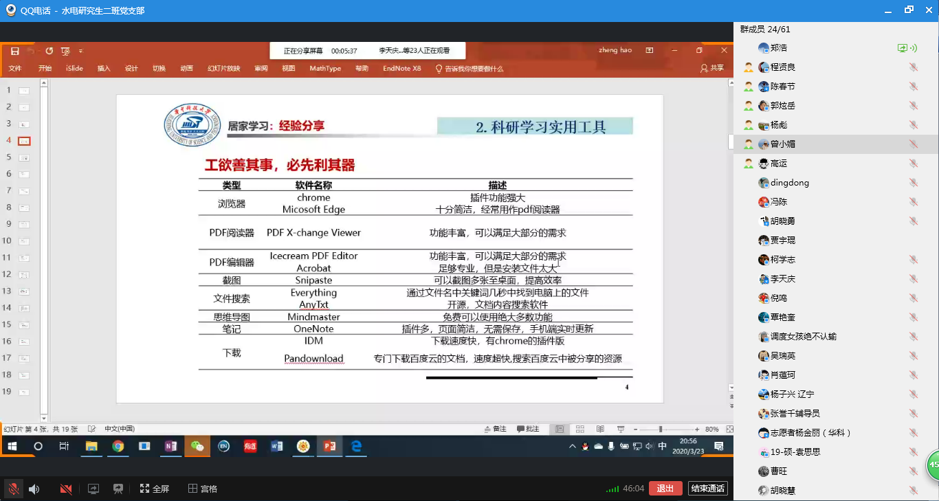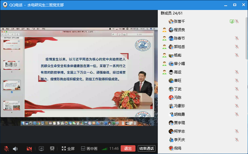3月23日组织生活会上,组织支部党员集中观看了习近平总书记考察湖北的相关视频,学习领会习总书记重要讲话精神,同时号召大家利用居家期间的空闲时间“读”抗击疫情优秀报道、爱国主义名篇佳作,并给出一些推荐书目。研究生辅导员张誉千讲授了以“坚定理想信念,共同抗击疫情”为主题的微党课,党员志愿者倪鸣分享了自己的志愿服务经历,博士生党员郑浩分享了居家科研学习的经验和建议。