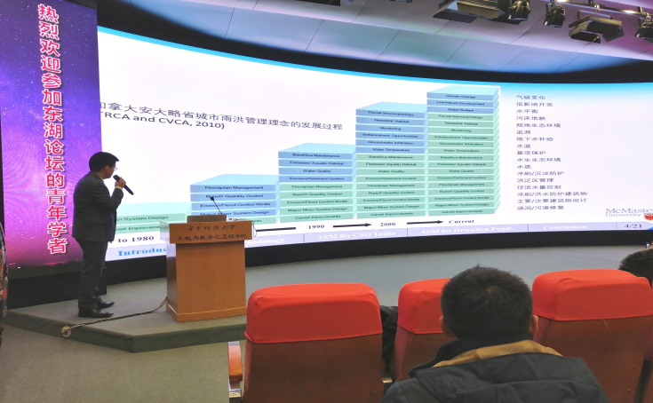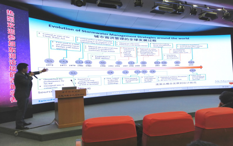 随后,王俊博士从多个地方的城市内涝带来的水质恶化、冲刷等恶劣危害,引入报告主题——基于随机解析模型的城市雨水控制研究。他从研究背景、研究方法、研究示例、总结,四个部分进行学术报告。王俊学者提出一种基于随机解析方法的新型水文模型,避免了概率解析模型对于系统初始蓄水量的假设要求,同时具备计算高效和便于应用的优点。他介绍了全球城市雨洪管理发展的历程和加拿大当地雨洪管理发展理念,让同学们了解到雨洪管理研究,是从局部,简单的方面一步步到一个系统。