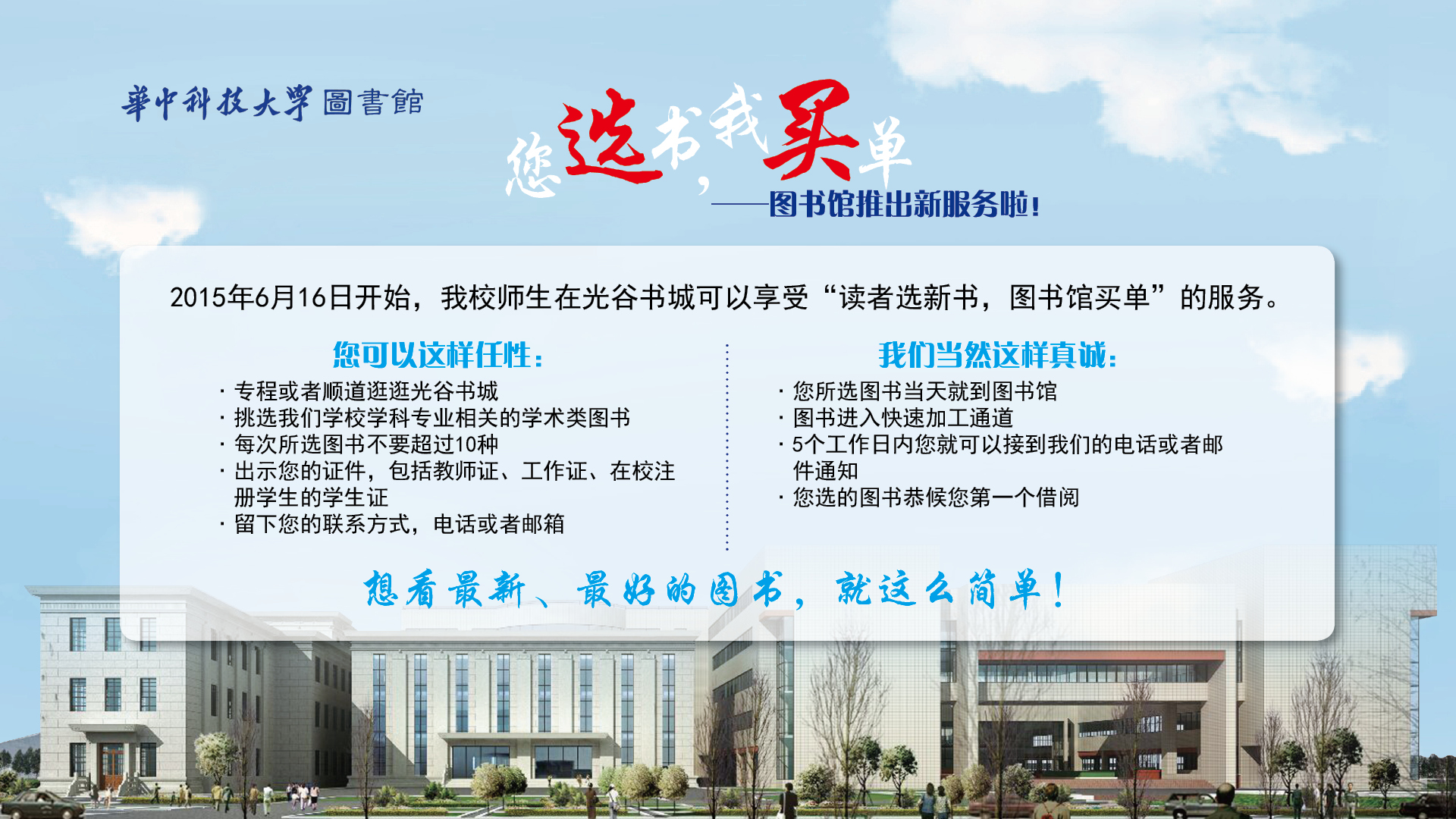 图书馆将于6月中旬开展“ 校内读者书店选书,图书馆买单”的活动:
