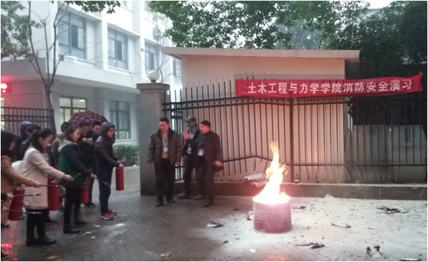 会后,在西六楼结构大厅西侧,现场进行消防演习。数十名师生亲身体验使用灭火器,扑灭被点燃的火源。最后还演示了消防车从地面打出高压水柱扑灭明火。