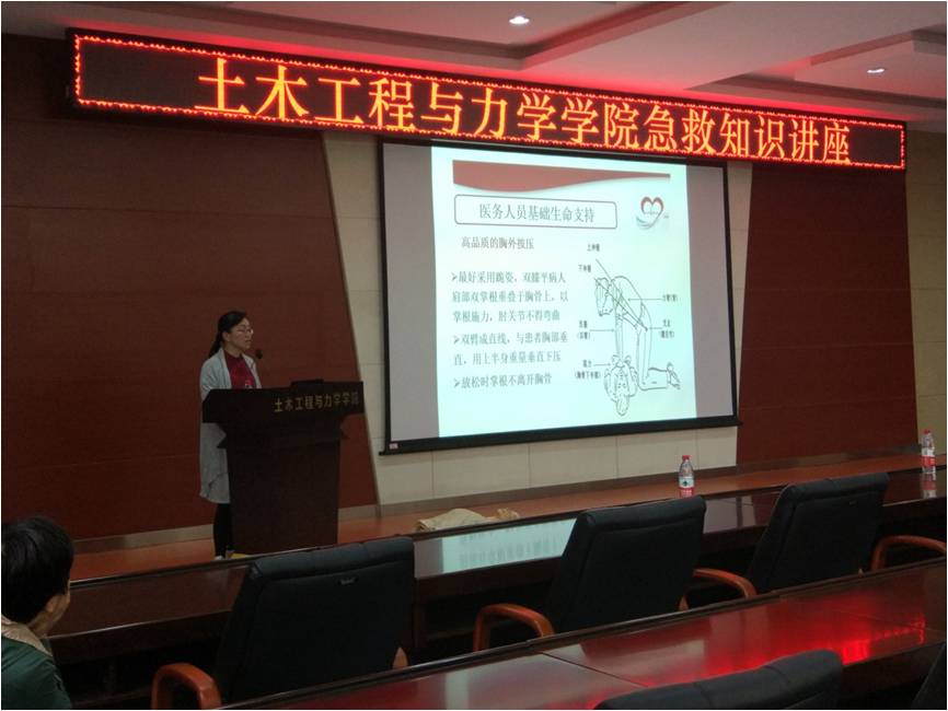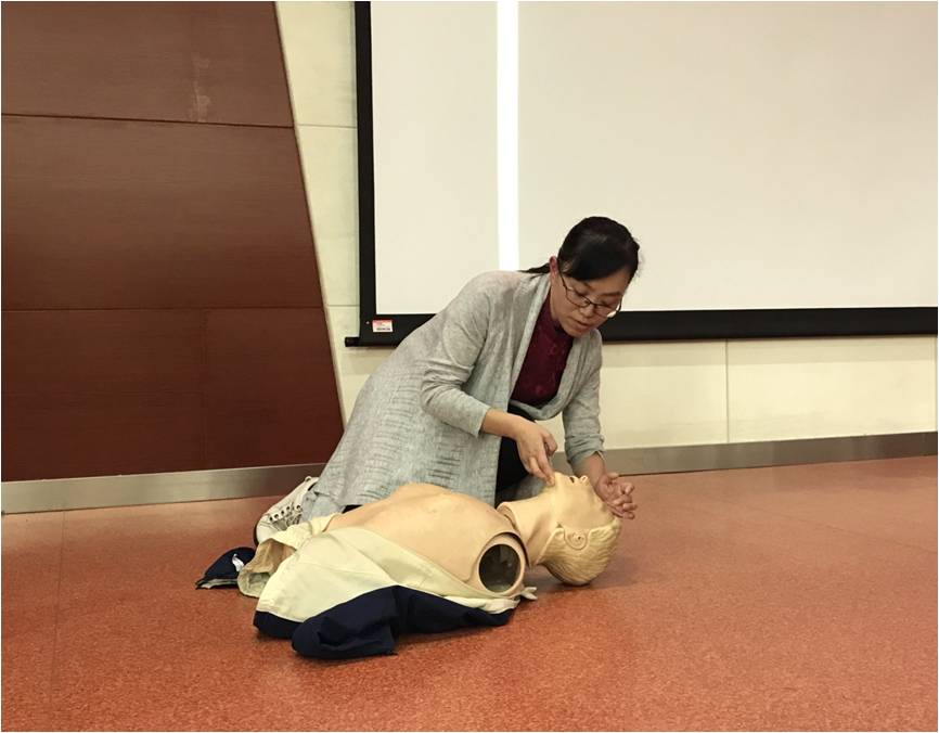 温医生结合高校师生的工作特点,图文并茂,详细讲解了心脏骤停的特征,后果,以及心肺复苏,排除气道异物等基本知识,并身体力行通过假人演示心肺复苏的方法。师生们反应强烈,掌声不断。会后,大家踊跃实践,在温医生耐心的指导下,规范地操作心肺复苏的步骤。