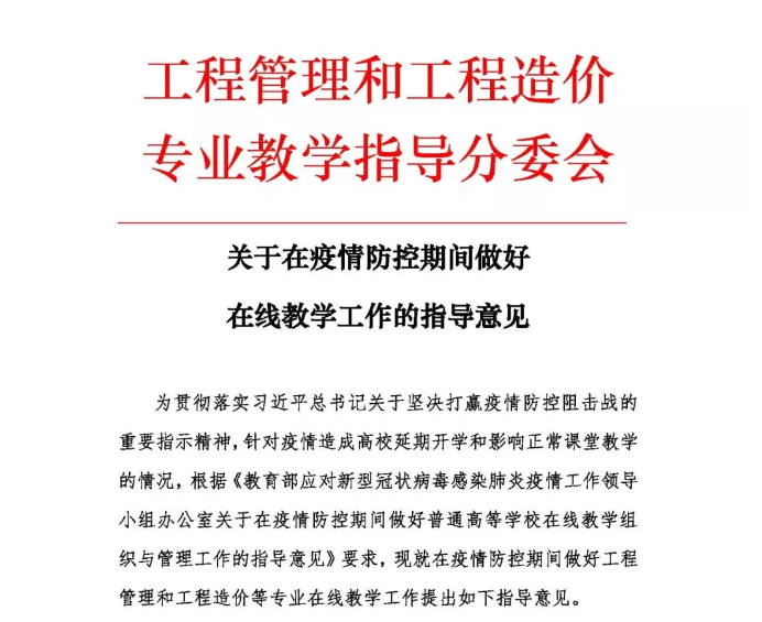 工程管理研究所高度重视疫情期间的教学工作。为做好在线教学工作,专门编写了《主要线上教学方式的特点与选择》《录制PPT讲解及在线教学的说明》等资料发送全系教师。目前,工程管理研究所教师承担的在线教学工作均正常开展。工程管理研究所代表教育部工程管理和工程造价专业教指委秘书处起草了教指委2020工作要点和《关于疫情防控期间做好在线教学工作的指导意见》,并编写了在线教学资源信息(第一期、第二期),受到有关高校的积极评价。
