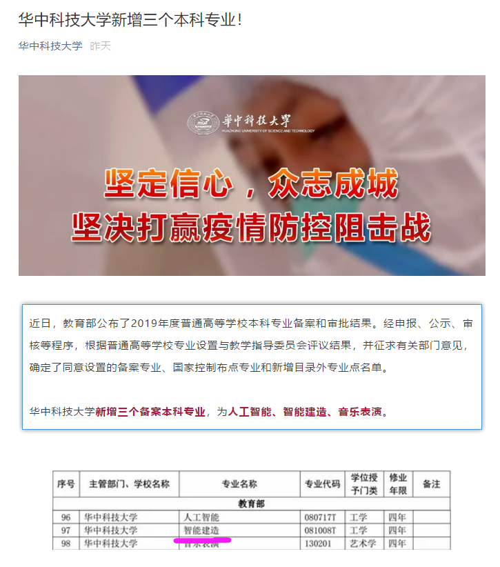 教育部日前发布了2019年新增专业目录,公司智能建造专业获得批准,成为全国三个设置该专业的双一流高校之一(同济大学2018年度、东南大学2019年度)。智能建造专业将面向未来工程科技、国家战略需求和产业升级转型,以工程科学知识体系为基础、融合土木工程、力学、机械科学与工程、计算机科学与技术、人工智能与自动化、管理科学与工程等多专业交叉的高水平教学、科研队伍,培养工程基础理论扎实、专业知识结构宽广、综合创新能力突出、科学与人文素养深厚的智能建造创新型工程科技人才,具备运用新一代信息技术解决工程建造过程中复杂问题的能力,胜任智能规划与设计、智能装备与施工、智能设施与防灾、智能运维与管理等领域的综合性和专业性工作,能够熟练掌握一种语言(计算机),驱动一台设备(机械),解决一个工程问题(土木)。工程管理研究所在公司和公司支持下,在疫情期间克服各种困难,认真做好新设专业的建设工作,坚持需求导向、标准导向、特色导向,把按社会需求办专业作为专业设置和调整的前提条件,把落实国家标准作为专业建设的底线要求。研究所组织骨干教师积极做好智能建造专业的培养方案、课程体系、教学计划、教学内容和各项招生宣传工作。周诚老师已开展新专业线上招生宣传等准备工作。