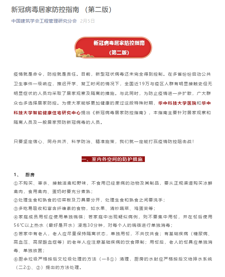疫情防控期间广大群众多选择居家防控,为保障居家安全,永利3044集团官网智能健康住宅研究中心周迎教授联合校医院专家编写了《新冠病毒居家防控指南》(以下简称为“《指南》”)。《指南》旨在从家庭中厨房、客厅等各生活空间和室内通风、给排水等各系统为着手点,对居家人员可能做出的行为和家庭内可能出现的情况进行全方位的指导。《指南》经中国建筑学会工程管理分会和永利3044集团官网官方公众号发布后,引发广大师生和社会关注,总阅读量迅速达到1万并不断升高。同时,《指南》还被头条新闻网、湖北资源职业公司、建筑名苑等网站和公众号转载,为广大人民群众居家隔离期间健康生活发挥了作用。