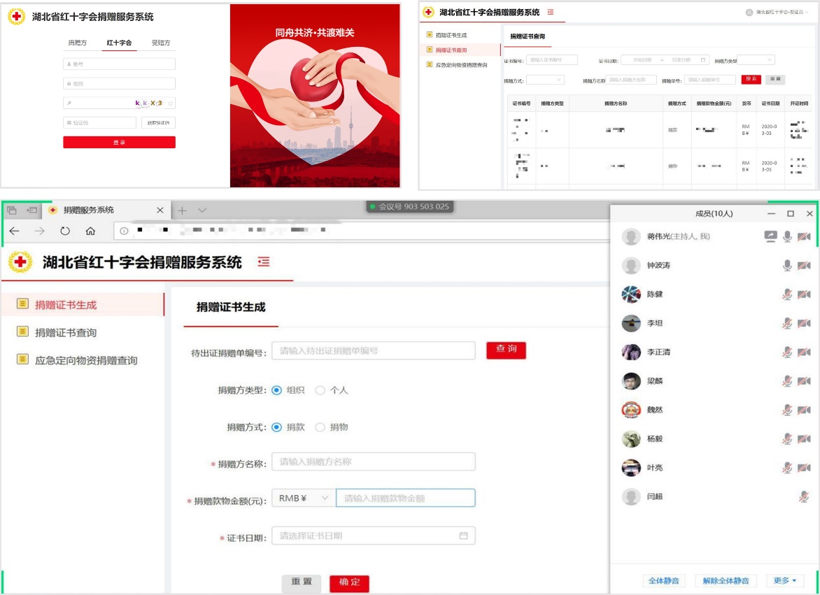 新型冠状病毒肺炎疫情牵动着全国人民的心,在海内外爱心人士及民间慈善组织的筹集下,大量应急救灾物资迅速涌入湖北省捐赠物资管理机构。快速处理、分发捐赠物资对疫情防控至关重要,为保障捐赠物资有序、高效、精准地送达至一线医疗单位,丁烈云院士组织成立专项工作组迅速开发“捐赠物资服务服务系统”。2月2日,丁烈云院士和王红卫教授,骆汉宾教授专程赴湖北省政府做了汇报。项目开发团队,日夜工作,用最短的时间完成了1.0版本系统的研发和部署,实现了面向“捐赠方,慈善组织,受赠方”的国内捐赠物资数据的动态管理。系统具备急需救援物资查询、捐赠单登记及审核、捐赠状态跟踪、受赠方签收资料跟踪以及捐赠证书生成等多项功能。下一步该系统还将成为政府机构、慈善组织与社会公众共享的服务型捐赠平台。截至3月5日,该系统平台已迭代3个版本,在湖北省红十字会与湖北省慈善总会内部正式运行,有效地节省了工作人员对捐赠信息的处理时间,大幅提高了应急物资审核与调度的效率。开发项目组钟波涛、陈健老师与工程师,组成系统实施保障组,深入应急防疫物资调度现场,靠前指导,基于新上线的系统平台,与慈善组织志愿者团队一道,共同组织实施一线物资调度工作。