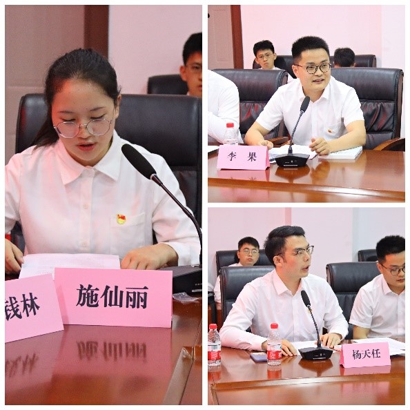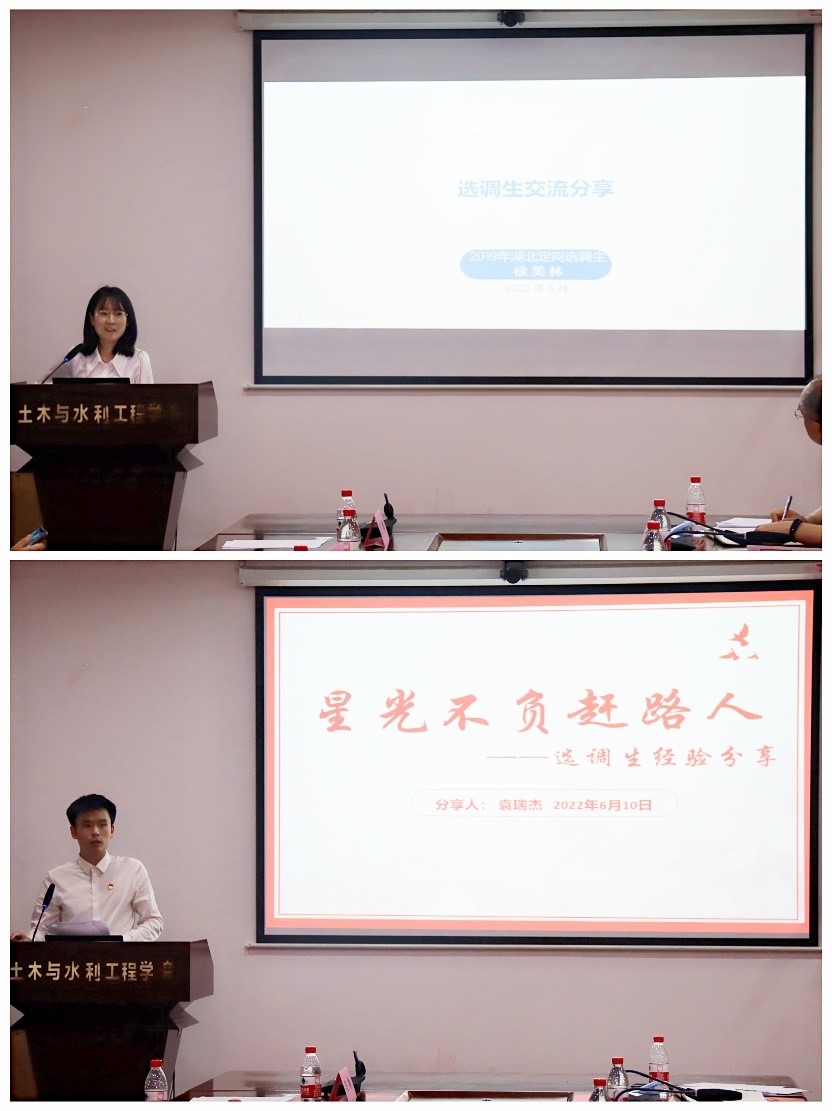 2019年湖北省定向选调生徐美林、2021年湖北省引进生袁瑞杰作为选调生员工代表分享了基层工作的感悟,同时勉励在校同学们要持续学习,敢于竞争,戒骄戒躁,谦虚严谨。
