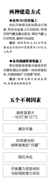 王宇向也向记者透露了降低成本的设想。他说,占比10%至15%的黏结剂是否可以减少到10%以内,强度依然不变;机械臂拼装施工可以设计一个更为轻质的设备减小地月运输成本。